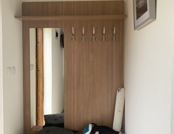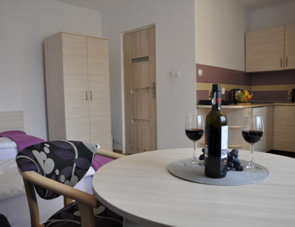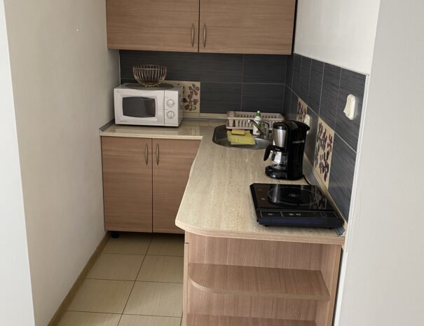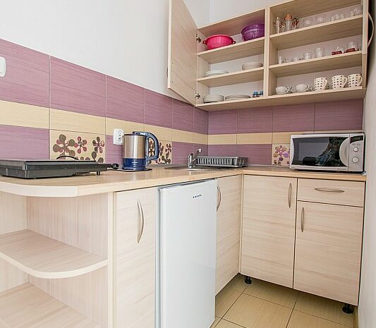 – Aneks kuchenny z lodówką, mikrofalą, płytą indukcyjną, zlewem oraz kompletem naczyń i sztućców.